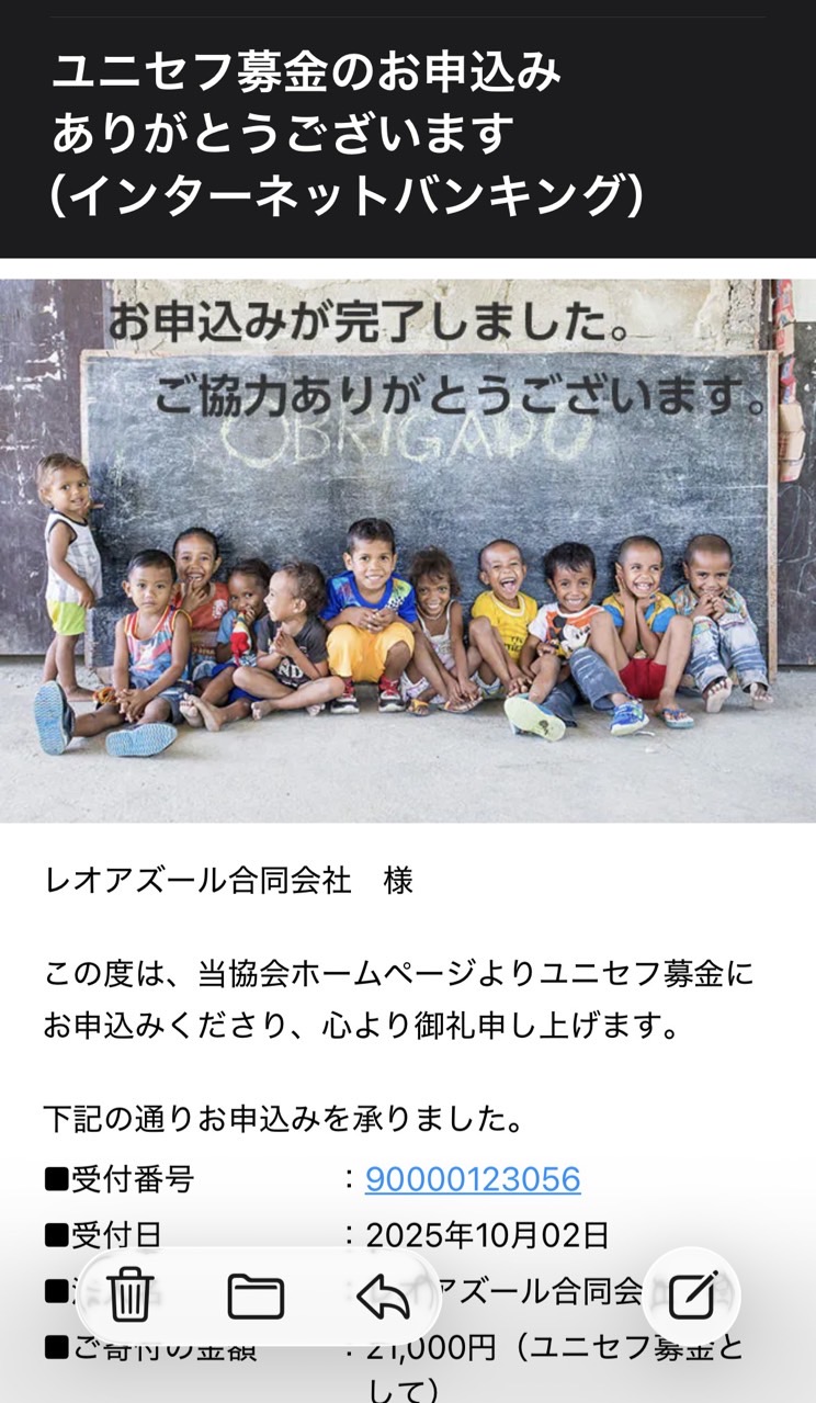 ご報告 投稿日: 2025年10月4日 投稿者: %s leaoazul 先日、販売しておりました2025ARTE八王子FCチャリティーTシャツも売上の一部をユニセフに募金いたしました。 com.nhncorp.m2app 24.1.4 この度は多くのご賛同をいただきありがとうございました。 今後ともよろしくお願い致します。